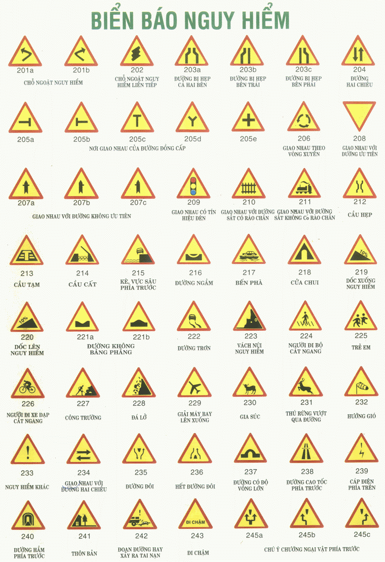 Biển báo nguy hiểm từ 201 đến 245 như trên hình. Biển có hình tam giác đều với viền đỏ, nền vàng bên trọng và các hình vẽ màu đen thể hiện sự nguy hiểm xảy đến có thể nên người điều khiển cần biết và tránh.